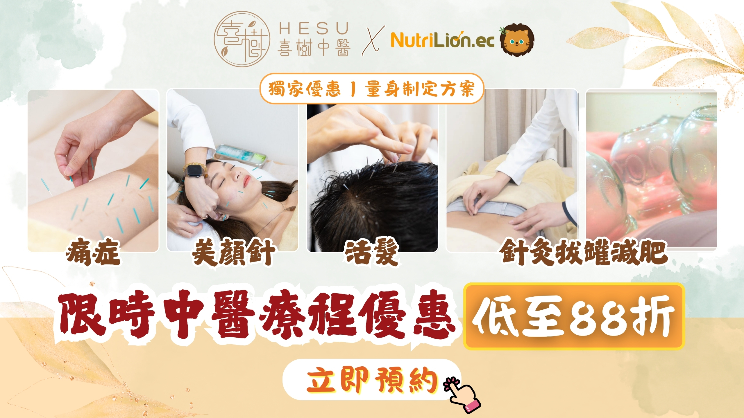 自從 NutriLion.ec 開Page以來,小編們偶爾都會收到讀者私訊,詢問有否推出中醫減肥、防治脫髮、紓緩筋骨痛症等療程。NutriLion.ec 編輯部收到大家的意見,故今次很高興能與喜樹中醫合作,滿足大家各種養生及健康需要。喜樹中醫設有一系列由註冊中醫師主理的活髮、美顏針、針灸拔罐減肥及痛症療程,能為患者量身定制個性化治療方案。是次中醫優惠為 NutriLion.ec 讀者獨家專享,最平低至88折!盼讓大家能以最優惠的價錢,體驗到中醫從古至今的醫術智慧,達至調理養生的功效!
