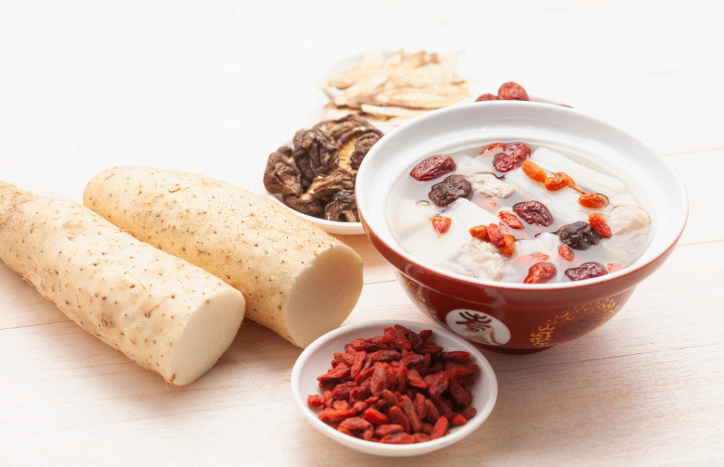 - 加入鮮淮山繼續燉煮約20-30分鐘。關火前加入適量枸杞,最後加鹽調味即可。