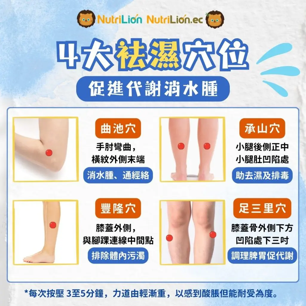 除了飲食調理,透過適當的穴位按摩亦有助加強身體排濕能力。中醫認為,刺激特定穴位可促進氣血運行、改善脾胃功能,從而幫助身體排走多餘水分與濕氣。以下4個常用穴位,簡單易按,在家亦可輕鬆操作。