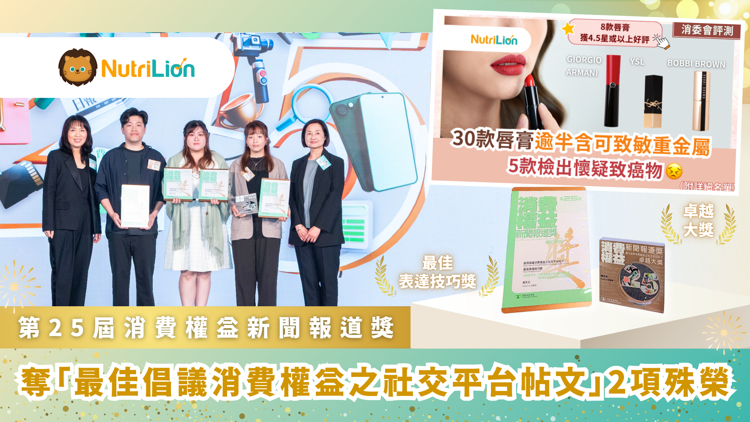 《NutriLion 營養獅》在今年首次參賽,即榮獲兩個重要獎項,包括「最佳倡議消費權益之社交平台帖文 — 卓越大獎」,以及「最佳倡議消費權益之社交平台帖文 — 最佳表達技巧獎」。上述獲獎的社交平台帖文為「消委會評測|30款唇膏逾半含可致敏重金屬 5款檢出懷疑致癌物【附詳細名單】」,帖文於2024年1月中刊出,圖文並茂詳列各種唇膏樣本的產品資訊、評分、價格、所含的不良成分等資料,並綜合出8款獲消委會4.5分高分推介的唇膏名單,讓讀者一目了然,往後能更精明選購合適又安全的唇膏。